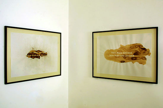 ΑΡΙΣΤΕΡΑ: Not More Than One Second, 2002. καφές και μολύβι σε χαρτί. 67x94 εκ. ΔΕΞΙΑ: Not Less Than One Second, 2002. καφές και μολύβι σε χαρτί. 67x94 εκ.